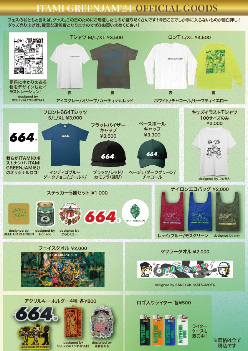 伊丹のポストナンバー664をロゴにしたデザインや、Tシャツバックプリントの一部にも描かれる盆踊りイラスト、女性イラストレーターの繊細なデザイン、伊丹の名店mogura cafeのキャラクターの4種を販売!